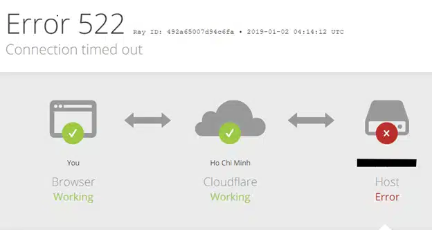 - Error 522: Connection timed out — Cloudflare cannot complete a TCP handshake with the server, often due to overload or firewall blocks.