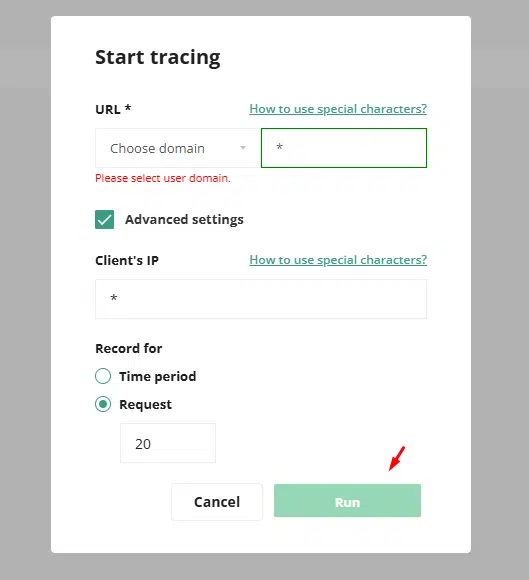 Here, you will define the parameters for your test. Select the domain you want to analyze and enter a URL Mask; use / to trace the homepage or * to capture traffic across the entire site. You can also specify your own Client IP to ensure the tool only records your specific testing session. Once you have set the expiration time and the number of requests to save, click Run to put the tracer into an active state.