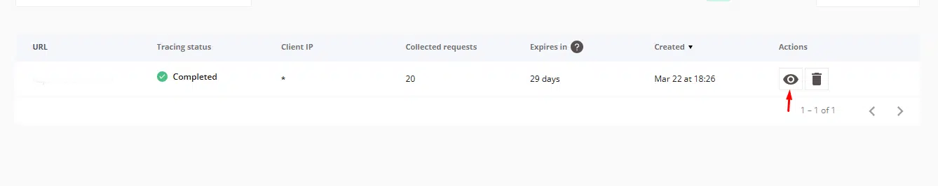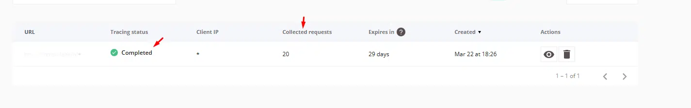 The trace list may also show details such as the selected URL, client IP, collected requests count, expiration period, and creation time