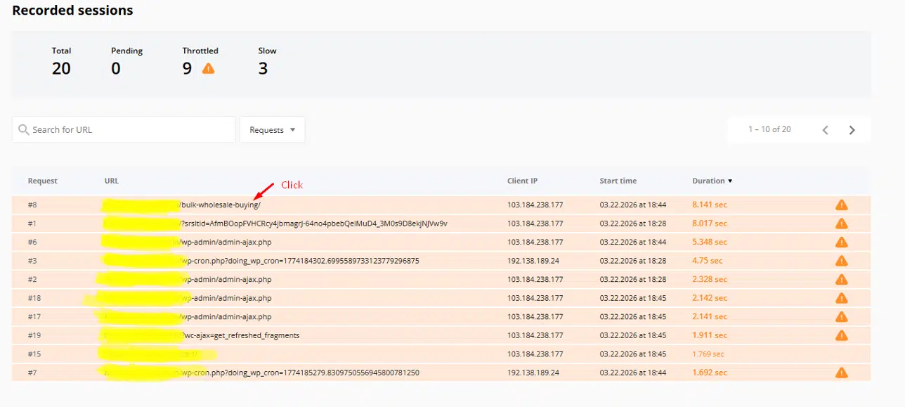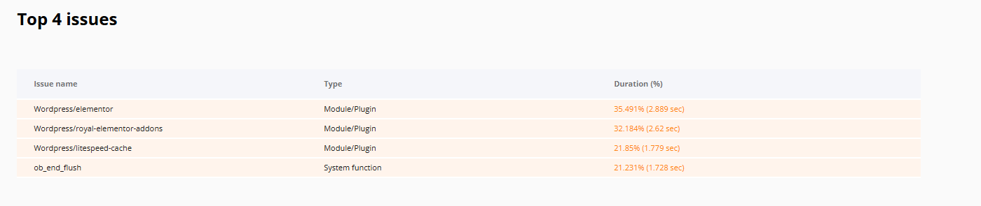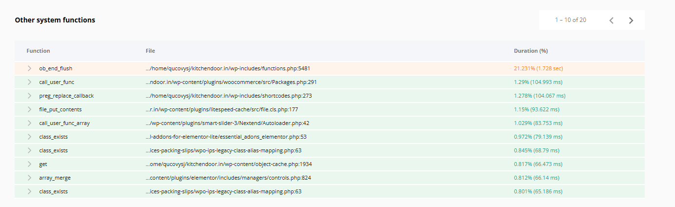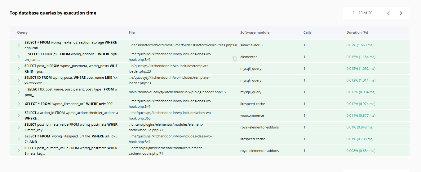 If the slowdown is not caused by an external request, the report can still help by showing details such as the top database queries by execution time, PHP call stack information, system function calls, and the related source file and line references. These details can help identify whether the issue is caused by custom code, a plugin, a theme function, or inefficient database queries.